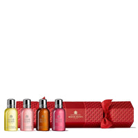 تحتوي مجموعة الاستحمام الاحتفالية بنفحات الفواكه والتوابل على أربع عبوات غسول جسم بحجم صغير، في صندوق ورقي أنيق على شكل لفافة. مثالي للإهداء في رأس السنة.